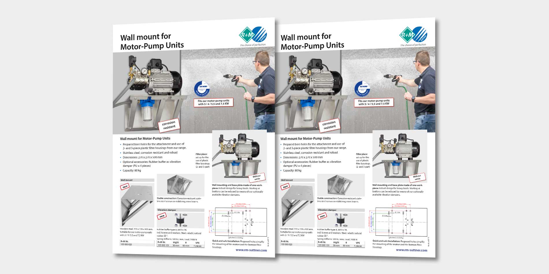 Benefit from customized solutions from R+M / Suttner: With the new, sturdy holder for motor pump combinations from Comet or Annovi Reverberi, we offer you the innovative solution for wall mounting with the integration of the associated filter.